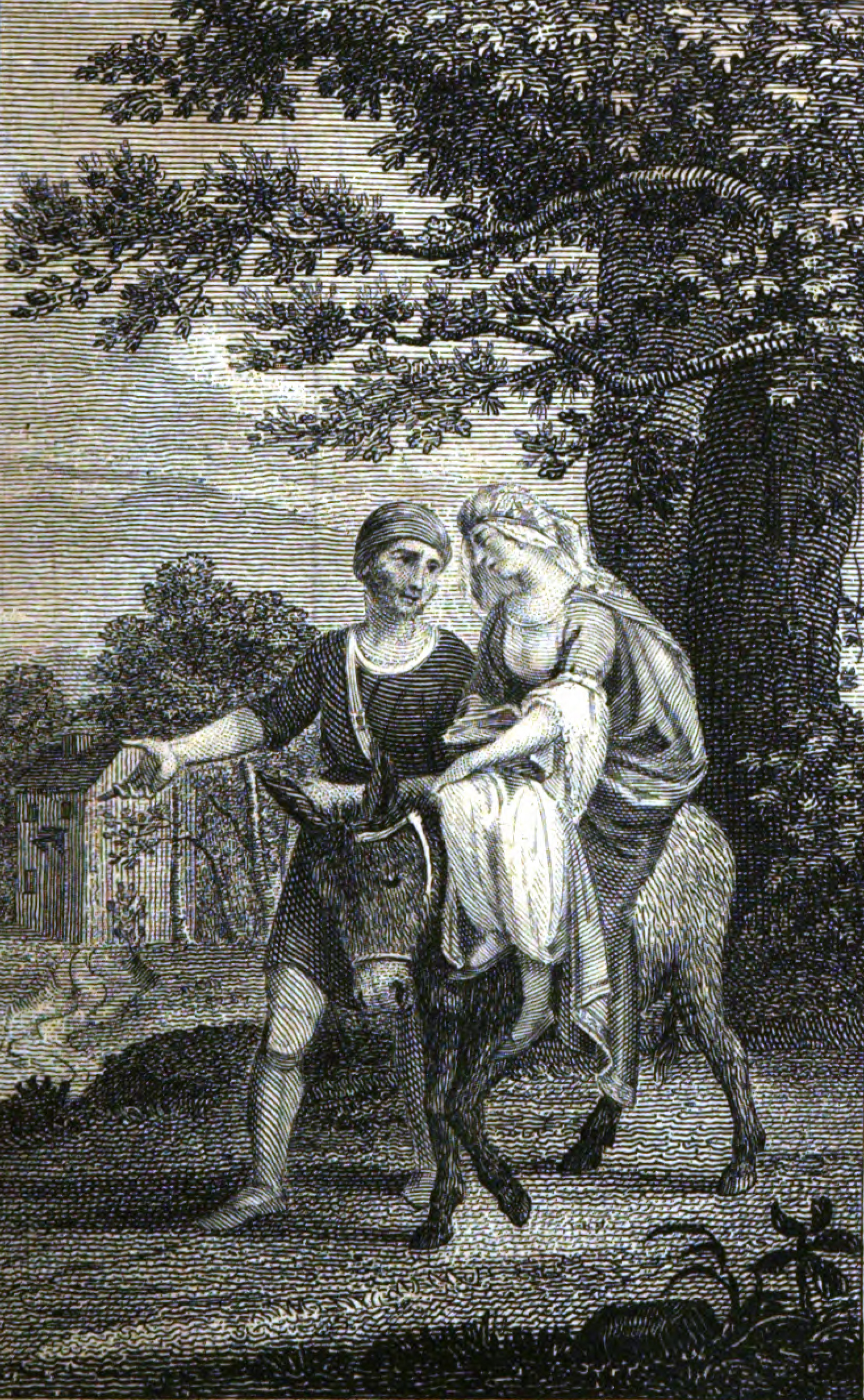 A male traveler (left) with a well-shaven beard, dressed in a loose cloth coat with short skirts, half sleeves, no collar, and a cap extends his right hand to show the way to his companion. On his right, a woman mounted on a donkey rides alongside him. The woman is wearing a brocade turban on her head and is dressed in Moorish attire. In the background on the left stands an inn. The man is leading her on the pathway to the inn.