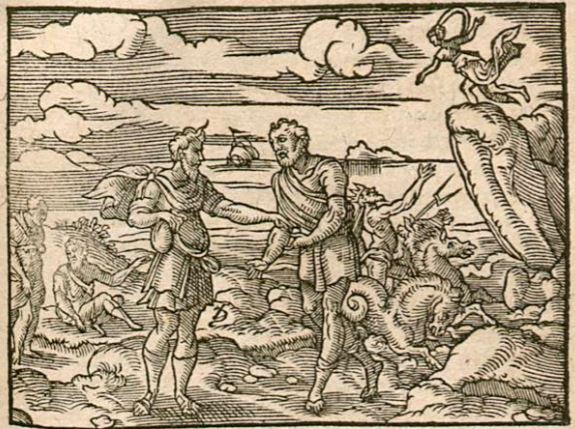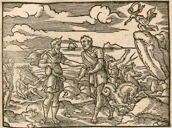 This engraving depicts the story of Mestra and her father, Erysichthon. Erysichthon was punished by Famine to have an endless hunger. He lost all his wealth to satisfy his hunger and cravings. When all was lost, he went so far as to sell his daughter. He is depicted in the centre of the image taking money from a man who had bought Mestra from him. Mestra is depicted on the right side of the image on top of a cliff looking down at the sea god, Neptune. She asks him for aid in return for him having stolen her virginity. Neptune helps her and offers her the gift of transforming herself into various animals. Once she is bought from the men that her father sold her to, she transforms herself in order to get away from them and get back to her father, only to repeat the process over again.