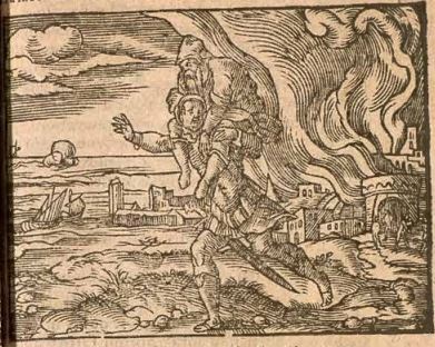 This engraving illustrates the Trojan warrior, Aeneas, escaping the fall of Troy with his father, Anchises on his shoulders. The city of Troy is in the background of the engraving, engulfed in flames as it burns to the ground. There are people depicted in the distance by the entrance of the city who follow Aeneas. Aeneas and his small company of people get in the ship that is illustrated on the water on the left-hand side of the engraving which leads them to the island of Delos.