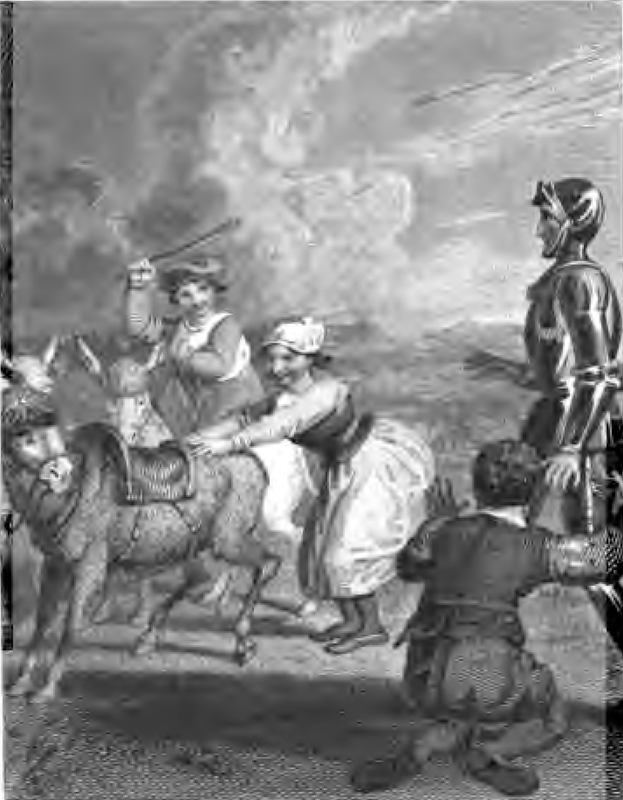 Having fallen from her donkey, Dulcinea (middle) clasps the donkey behind with both hands in preparation to jump back on to the saddle. Don Quixote (right) clad in armor, alights to help Dulcinea back upon her palfrey, but is surprised to see that she is capable on her own. Sancho Panza having fallen to his knees, raises his hands and turns towards Dulcinea. In the background, one of Dulcinea's companions waits for her to remount with a stick raised in her right hand.