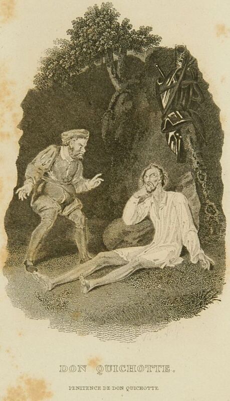 - After performing acts of penance, Don Quixote sits, dazed and dressed only in his undergarments. Sancho Panza discovers him in this state; his face bears an expression of bewilderment and surprise. Signed by L. H. Sisco (engraver). Part 1, ch. 29.