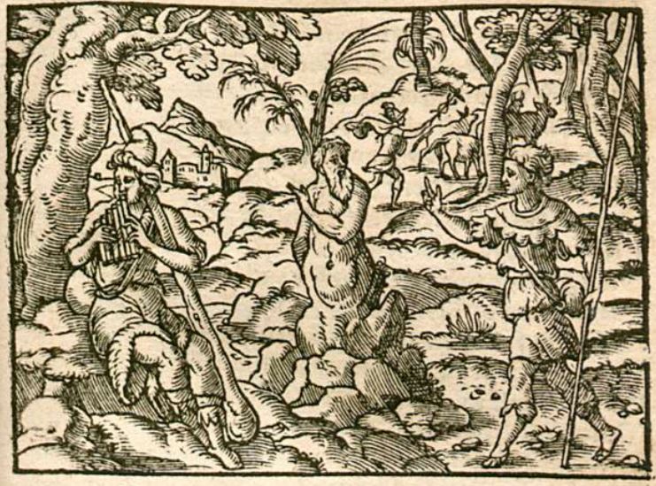 This engraving illustrates the story of Mercury and Battus. Mercury had stolen a herd of cattle from Phoebus, who is illustrated sitting on the left-hand side of the image playing his seven-reeded pipe. The only person to have witnessed the theft was old shepherd named Battus. Mercury had promised Battus a cow in exchange for his silence. Battus agreed to keep the theft a secret, however, Mercury tested Battus’ word by disguising himself and asking him about the robbery and promises him a cow and a bull for the information. Battus tells the stranger that Mercury had stolen the cattle, unknowing that the stranger is in fact Mercury. Mercury punishes Battus for betraying him and transforms him into touchstone. Battus is illustrated in the middle of the engraving with the lower half of his body already transformed into stone.