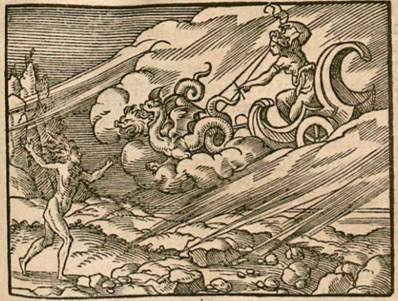 Ceres intends to punish Erysichthon, an impious man who had chopped down a tree sacred to the goddess herself. She plans to send the personification of Famine to Erysichthon so that he is penalized for his hubris. Ceres, however, is unable to meet Famine herself as they are antithetical to one another. Ceres commands an Oread to meet with Famine in her place. Ceres is illustrated in the engraving on her snake-drawn chariot in the sky, pointing at the Oread as she issues her command.