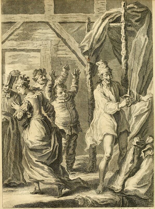 Don Quixote attacks the wineskins, while Dorotea averts her eyes. In the background, the priest, Cardenio, the innkeeper, and Sancho Panza (left to right) are pictured. Plate no. 21, signed by J. Vanderbank (illustrator) and G. van der Gucht (engraver). Vol. 1, book 4, ch. 8.