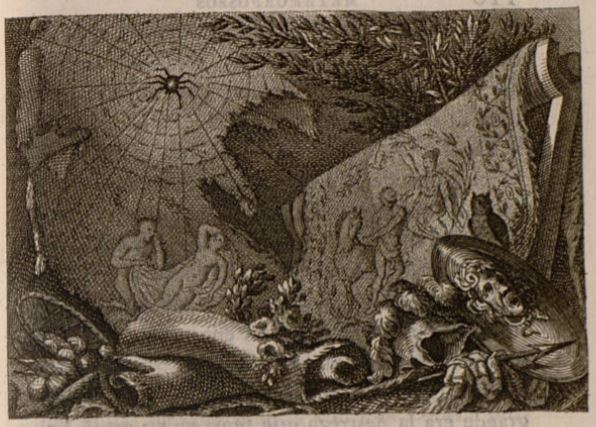This image refers to the story of Arachne and Minerva. Arachne was a skilled weaver and she said that she was a better weaver than the goddess Minerva. Minerva, angered by the hubris spoken against her, challenged Arachne to a weaving contest. When Minerva won the contest, she transformed Arachne into a spider. This image depicts the transformed Arachne in the shape of a spider on a web. There are also cloths with embroideries on them to show the importance of weaving and spinning in this tale.