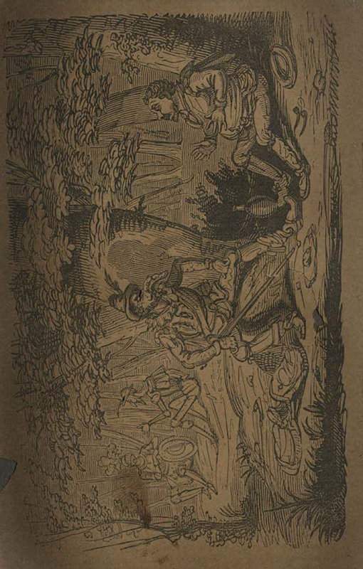 On the dawn of Don Quixote's duel with the Knight of Mirrors, Sancho is surprised to see that the Squire of the Woods' nose has grown to an enormous size with plenty of pimples and warts, such that his hat falls off his head. Sitting on a rock, the Squire of the Woods appears unmoved by his own enlarged (fake) nose, his sword resting against his lap. In the background, Don Quixote chats cordially with the Knight of the Mirrors.