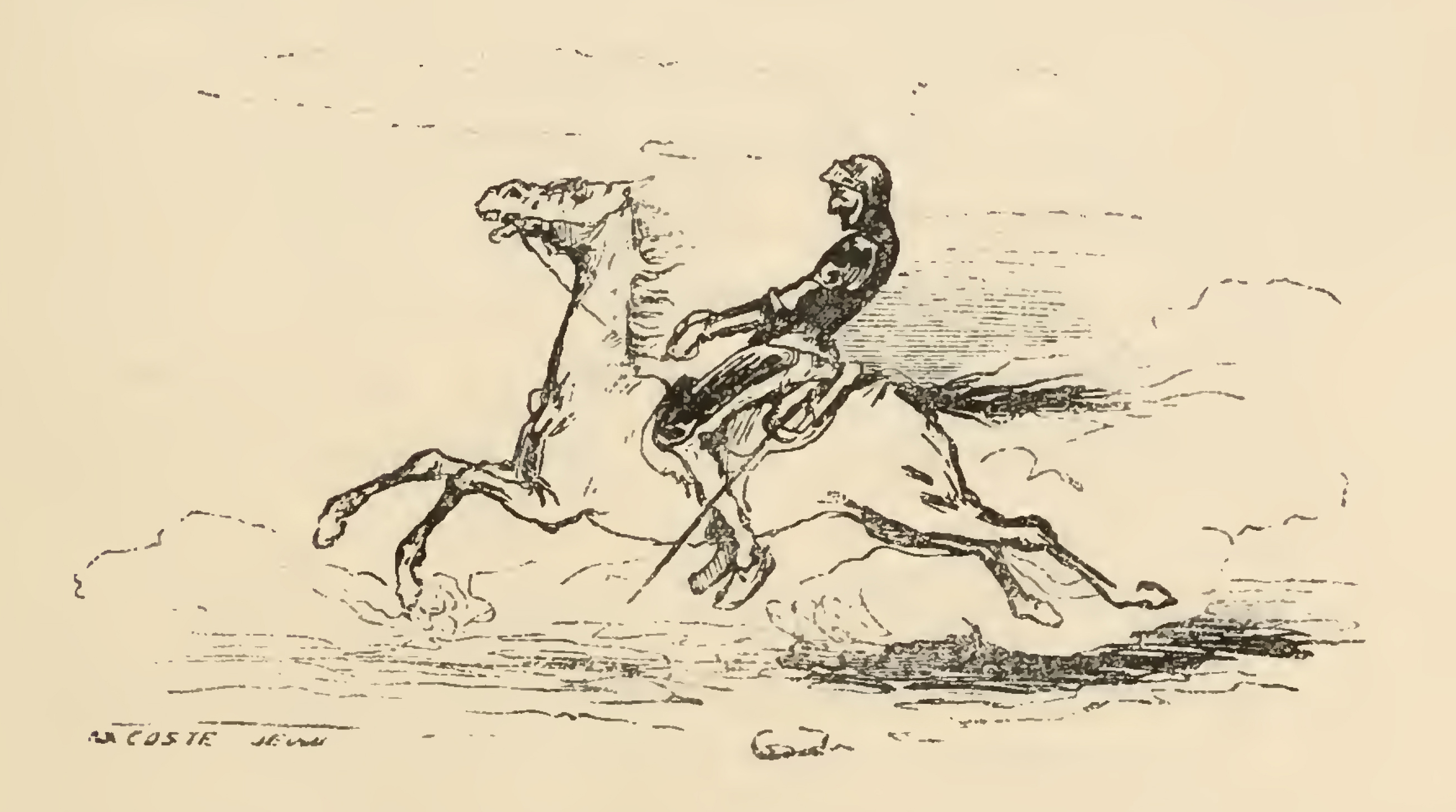 Rocinante, startled by the bells of the court jester, runs about the field at a great pace. Don Quixote, clad in full armor, holds the reins tightly and leans back precipitously, trying to stay on his horse.