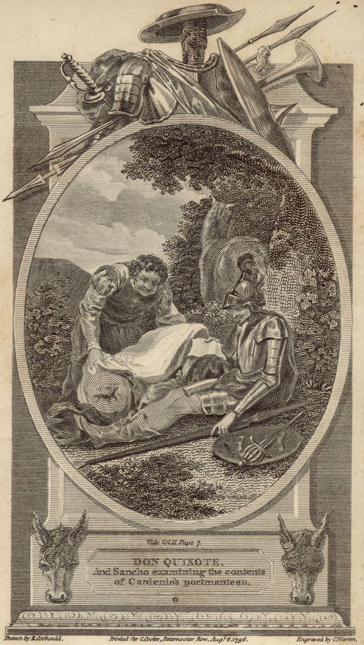 In Sierra Morena, Don Quixote and Sancho Panza find a travelling case, inside which are four shirts of fine cambric, a pile of gold escudos wrapped in a handkerchief, and a small, richly decorated diary. Opening the book, Don Quixote finds a sonnet written in a very fine hand. He reads it aloud so that Sancho can hear it. The illustration is set in a decorative and architectural frame, complete with the errant knight’s arms (lance, sword, helmet, and buckler) and donkey heads. Signed by R. Corbould (illustrator) and C. Warren (engraver), dated 1796. Part 1, ch. 23.