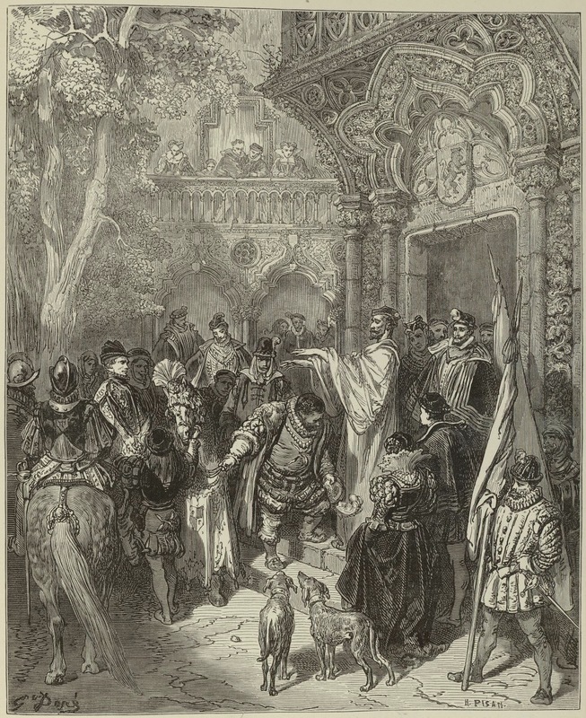 Before leaving for Barataria Island, Sancho Panza receives Don Quixote’s blessing. Also pictured in the palace courtyard are the duke, the duchess, and several of their servants. Signed by G. Doré (illustrator) and H.-J. Pisan (engraver). Part 2, ch. 44.