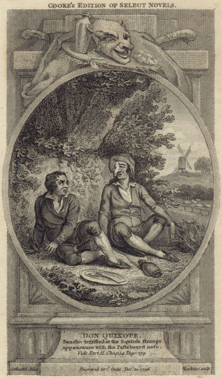 At dawn, Sancho Panza is frightened by Tomé Cecial’s ugly (and fake) nose. In the background, a windmill. The illustration is set in a decorative and architectural frame, complete with a mask. Signed by R. Corbould (illustrator) and W. Hawkins (engraver), dated 1796. Part 2, ch. 14.