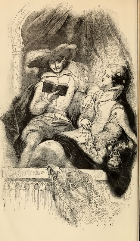 The duke (middle), in a fanciful chair sits reading a book in his right hand, a ring upon his index finger. The duchess (right) stares absent-mindedly into the distance, a feather duster in her right hand resting upon her lap. In the foreground, an expensive vase rests on a table filled with flowers. In the background hang some drapes. There are a lot of flowing cloth in the illustration.