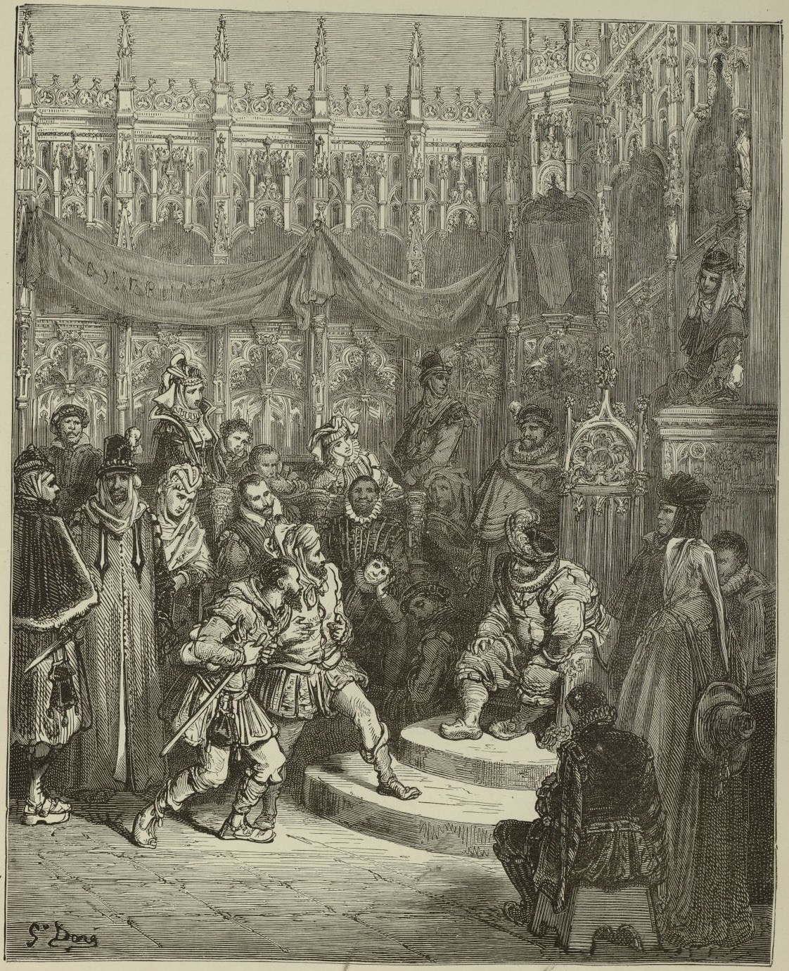 In Sancho Panza’s court at Barataria Island, the plaintiff accuses the defendant of withholding repayment of a loan. Sancho orders that the defendant’s staff be broken, spilling the coins that are hidden inside. In the background, a man and a woman await the next judgement. Signed by G. Doré (illustrator) and H.-J. Pisan (engraver). Part 2, ch. 45.