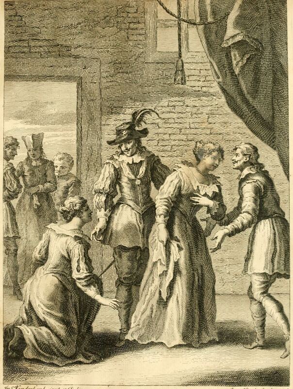 Dorotea kneels before Don Fernando, while Luscinda confesses her love for Cardenio (left to right). The priest, the barber, and Sancho Panza are pictured in the background. Plate no. 22, signed by J. Vanderbank (illustrator) and G. van der Gucht (engraver). Vol. 1, book 4, ch. 9.