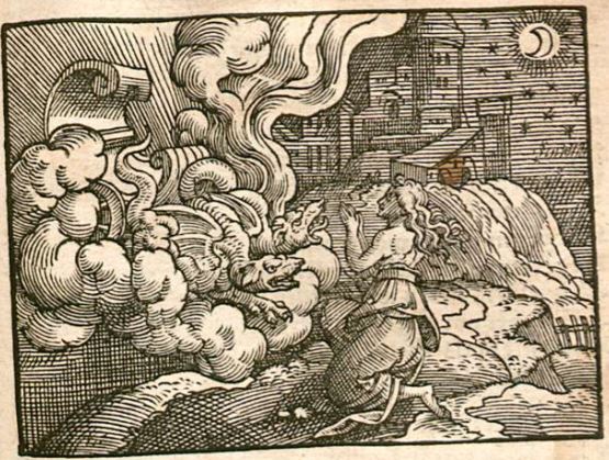 This engraving is difficult to make out, as it is purposefully drawn dark to symbolize that it is the middle of the night. This is also depicted through the moon and stars being drawn in the top right corner of the image. The woman illustrated in the engraving is Medea, the wife of Jason and daughter of King Aeetes of Colchis. She is depicted on her knees as she was praying to the goddess Hecate for help. She was praying for help because her husband Jason wished to prolong his father’s life. The goddess heard Medea and sent help by means of a chariot drawn by dragons. Medea uses the dragons to fly around the Earth for nine days and nine nights in order to find special herbs that will lengthen her father-in-law's life.