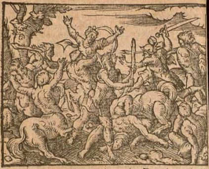 This engraving depicts a chaotic battle between centaurs and the Lapiths. The battle broke out due to one of the centaurs, Eurytus, stealing the bride of Pirithous, the king of the Lapiths. The centaurs were invited to the wedding ceremony, however, Eurytus betrayed Pirithous by being overtaken by Hippodame’s beauty and dragging her off. Eurytus is illustrated almost in the center of the engraving with Hippodame in his arms as he carries her away. Her arms are in the air as she pleads for help. Pirithous’ friend, Theseus, is illustrated to the right of Eurytus with a helmet on, and his sword behind his head, ready to swing at the centaur and save Hippodame.