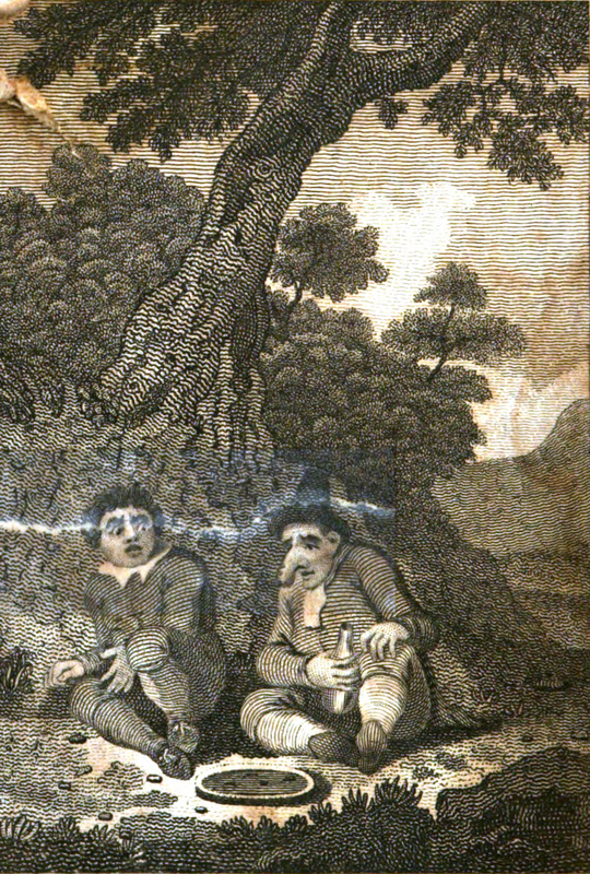 In the early morning beneath a tree, Sancho Panza (left) falls onto his side and trembles, his eyes enlarge at the sight of the Squire of the Wood's gargantuan nose. The Squire of the Wood (right) is sitting with a bottle in his right hand and is wearing a tall cap. His nose is so large that it casts a shadow over his body. In front of the two squire's there is a plate.