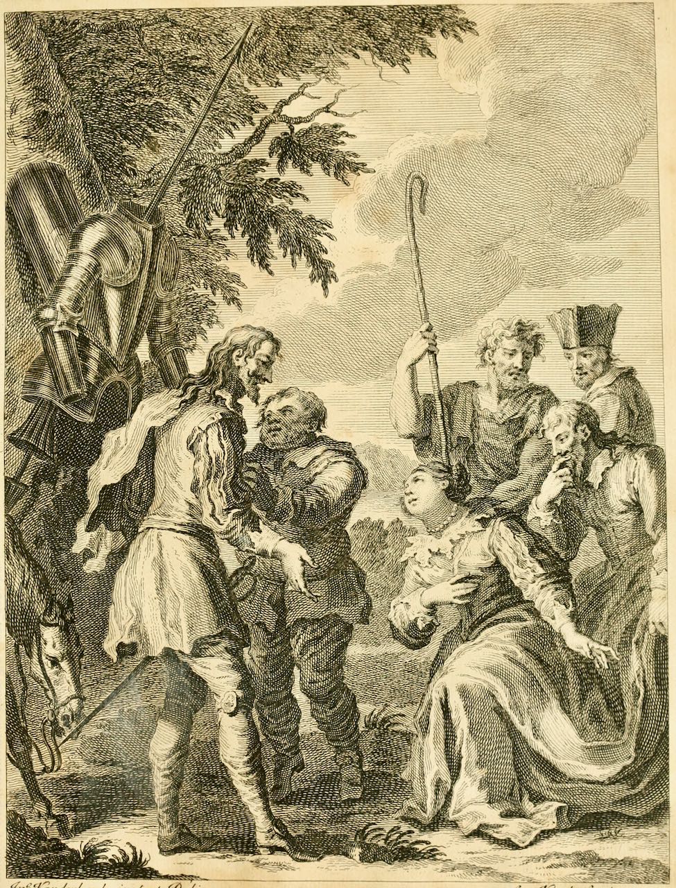 Princess Micomicona (Dorotea) kneels before Don Quixote, while Sancho Panza explains who she is. The barber, disguised with a beard, appears as her squire. In the text, the priest and Cardenio are hidden from view, while in the illustration they are pictured in the scene. Plate no. 19, signed by J. Vanderbank (illustrator) and G. van der Gucht (engraver). Vol. 1, book 4, ch. 2.