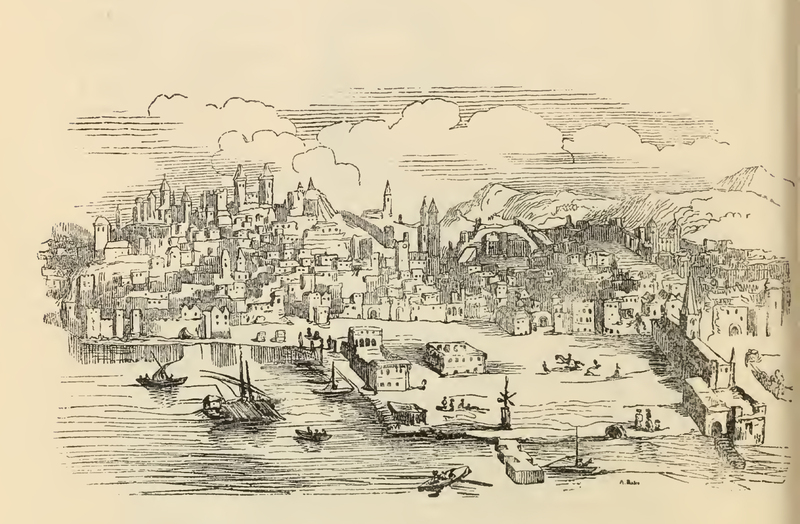 A landscape of a city from the direction of its port, where many fishing boats sail to and fro. The city is made of stone and of an old spanish architecture with a wall built in its midst, the city also appears to have been build on a mountain or a hill. In the background on the right there are more, taller mountains. The image is occasioned by the bachelor Sampson Carrasco saying "that I verily believe that there are at this very day above twelve thousand books published of that history ; witness Lisbon, Barcelona, and Valencia, where they have been printed, and there is a rumour that it is now printing at Antwerp. For my part, I foresee that no nation nor language will be without a translation of it."