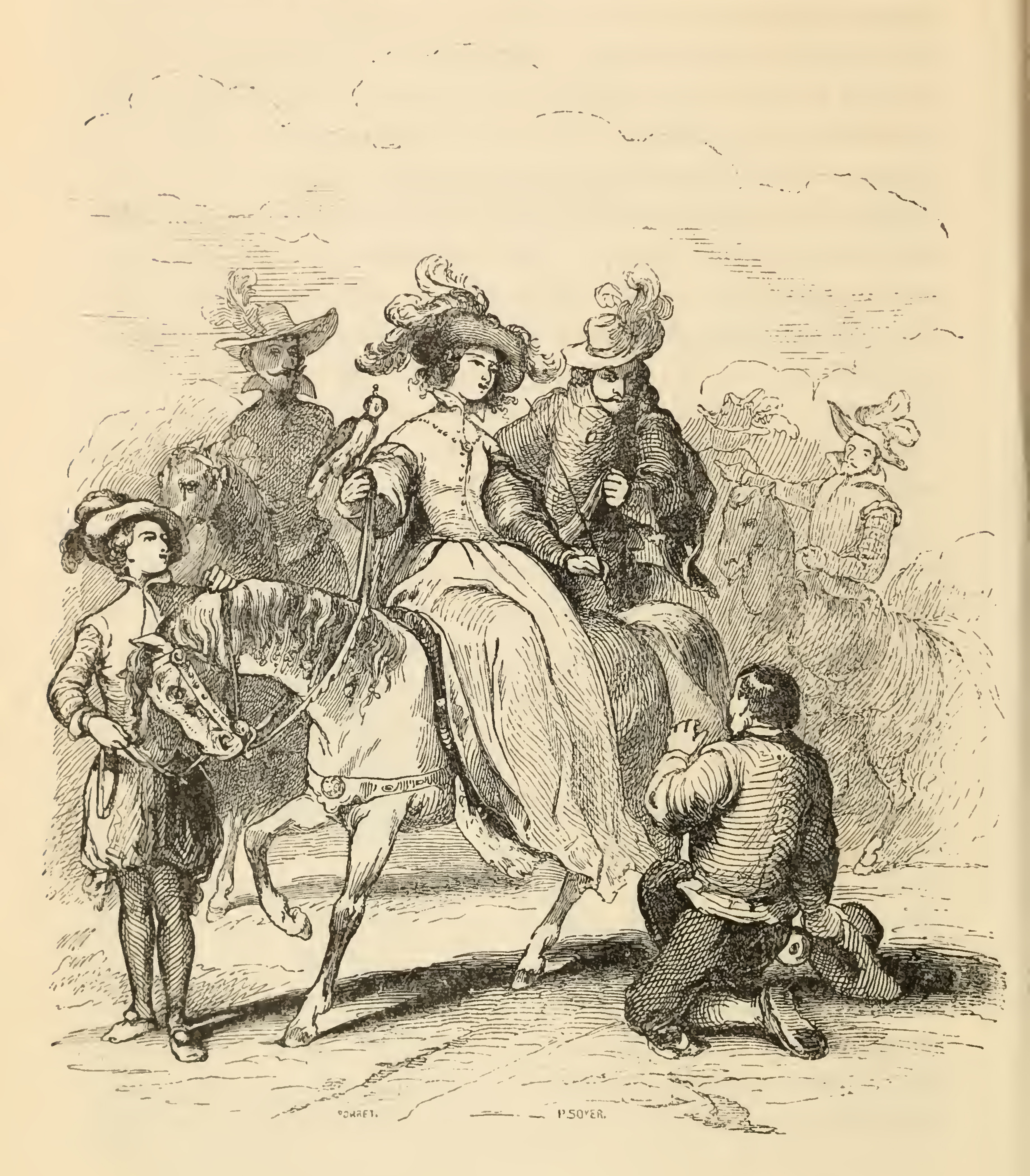 Sancho Panza (right) kneels before the duchess, pictured as a gallant lady upon a palfrey, sitting sideways on her horse with a side-saddle of cloth of silver. For her attire she is dressed full of elegance and richness and on her right hand she carries a hawk. She is accompanied by a page (left) who holds the reins of her horse, and four moustachioed companions each with identical attire and plumed hats, who accompany her on the hunt.