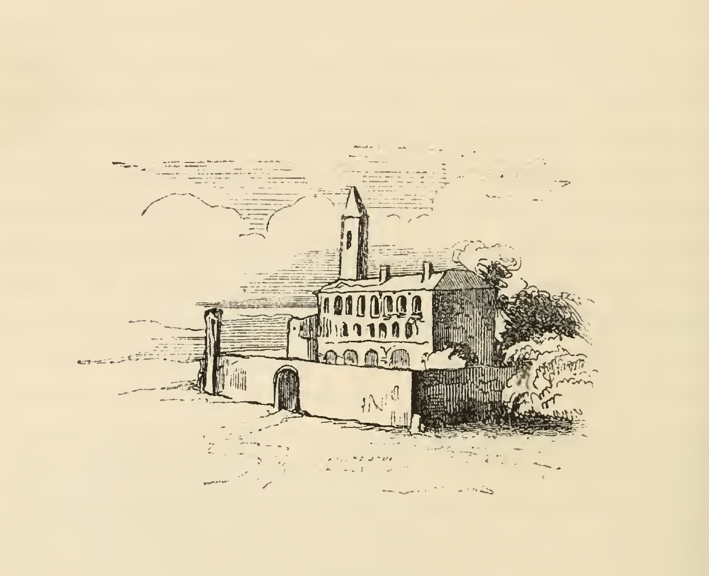 Don Diego's village pictured in the afternoon at around two o'clock. A beaten path leads to a large archway and a rectangular wall surrounding a large building with many openings. The image is occasioned by Don Diego saying "But let us make haste, for it grows late, to my village and house, that you may repose and refresh yourself after your late toil, which, if not of the body, has been a labor of the mind, the fatigue of which usually affects the body too."