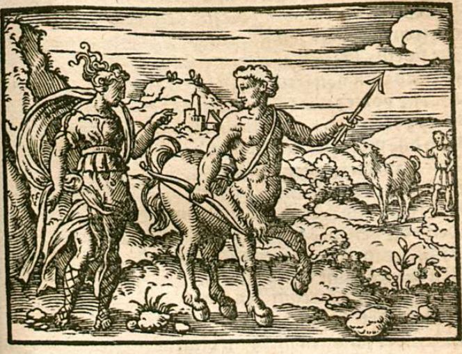 This engraving depicts the centaur named Chiron who had just agreed to look after the child of Coronis and the god Phoebus. Beside Chiron is his daughter Ocyrhoë, who is gifted with the power of prophecy. She is speaking to her father making a prophecy that this son of Phoebus and Coronis named Aesculapius will grow up to have the power of healing and raising people from the dead. She explains that this will anger Jupiter and result in Jupiter killing him with a thunderbolt, and in turn will result in raising his own self from the dead. Chiron is depicted looking at his daughter while holding a bow in his right hand and an arrow in his left. Ocyrhoë is depicted looking and pointing towards her father.