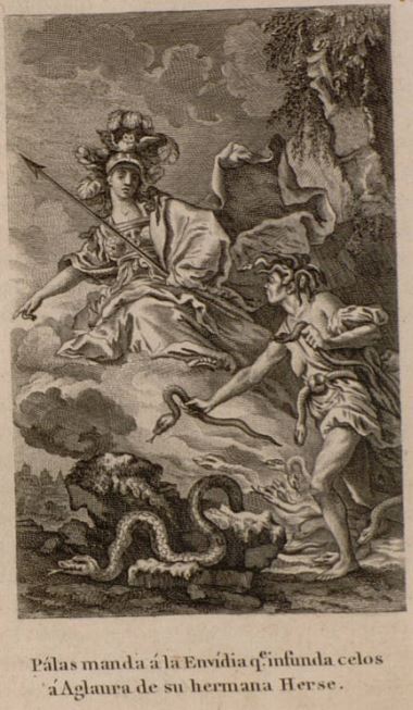 Palas manda a la Envidia q.e infunda celos a Aglaura de su hermana Herse