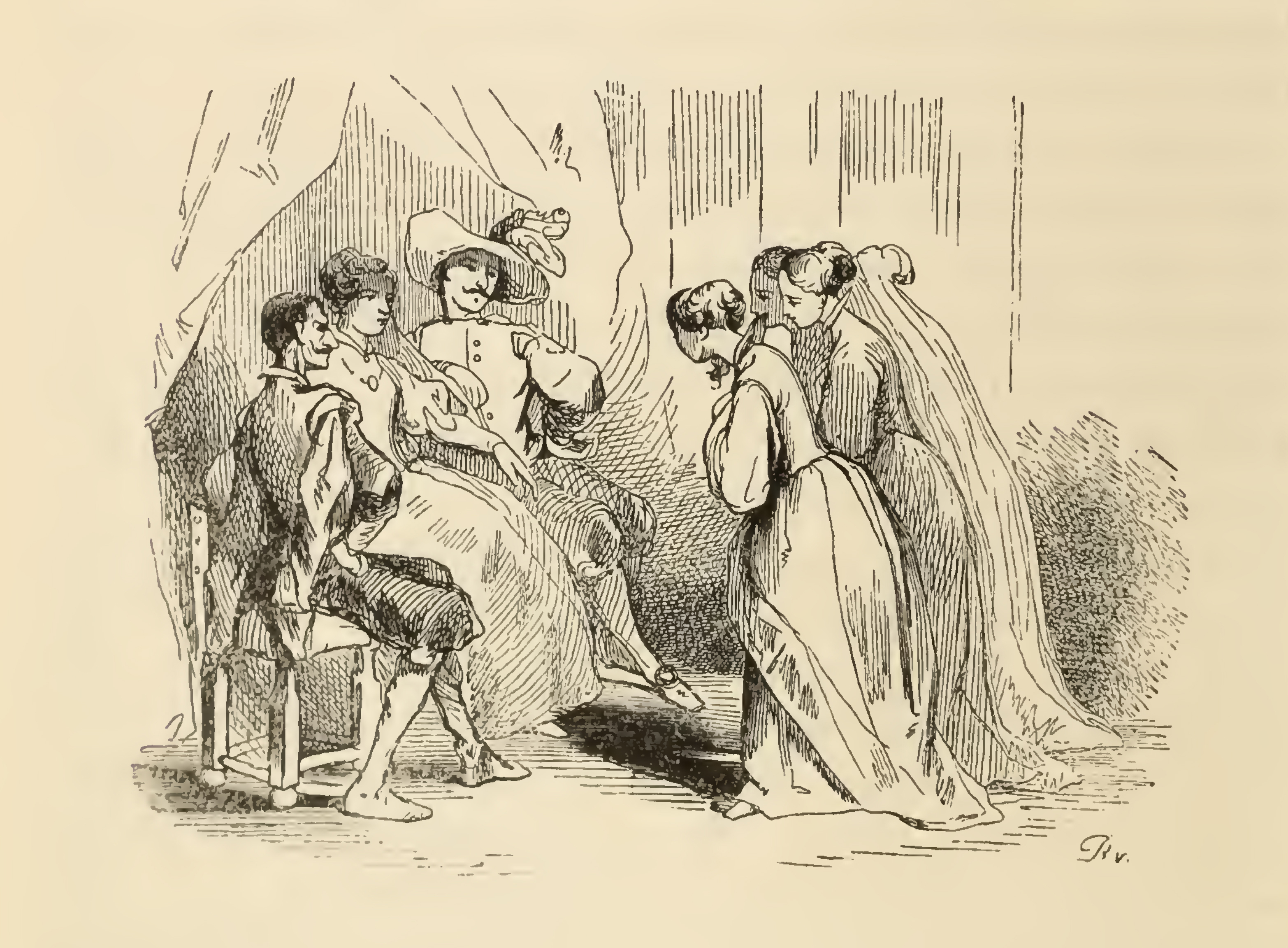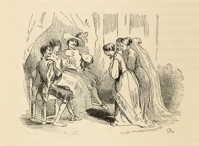Having finished dinner, Don Quixote, his hands on his hip (leftmost) sits with the duchess, dressed in a white dress and medallion upon her neck, (left middle) and the duke (left) who wears a wide plumed hat. Their chairs all face towards the right where four damsels have entered and bow slightly before their masters, not daring to make eye contact.