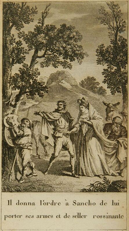 In Sierra Morena, princess Mimicona (Dorotea) kneels before Don Quixote and begs for his help. The barber is disguised as Dorotea’s page with a fake beard (an oxtail). Don Quixote orders Sancho Panza to bring him his arms and to saddle Rocinante. Signed by C. Lefebvre (illustrator) and L.-M. Halbou (engraver). Part 1, ch. 29.