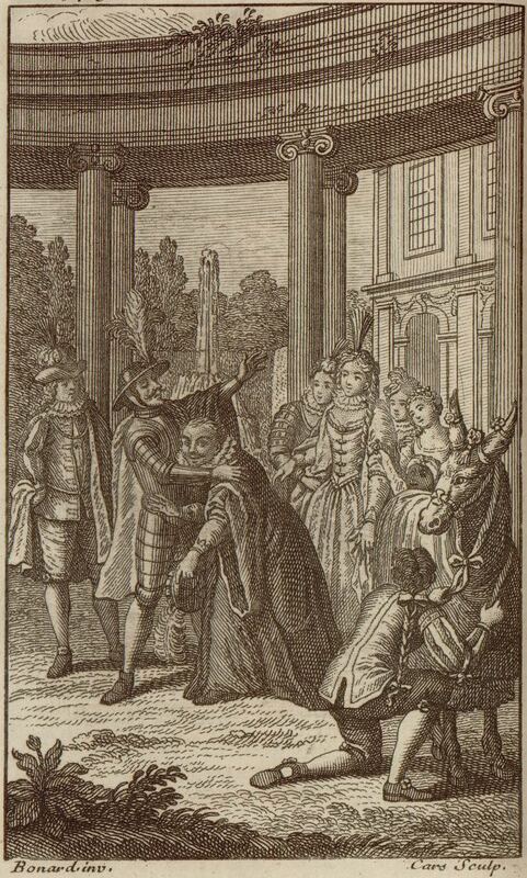 Don Quixote embraces his squire before Sancho Panza departs for Barataria Island. To the left, the duke. To the right, the duchess and her servants. In the background, the duke and duchess’ residence. Signed by Bonard (illustrator), no given name, and L. Cars (engraver). Part 2, ch. 44.