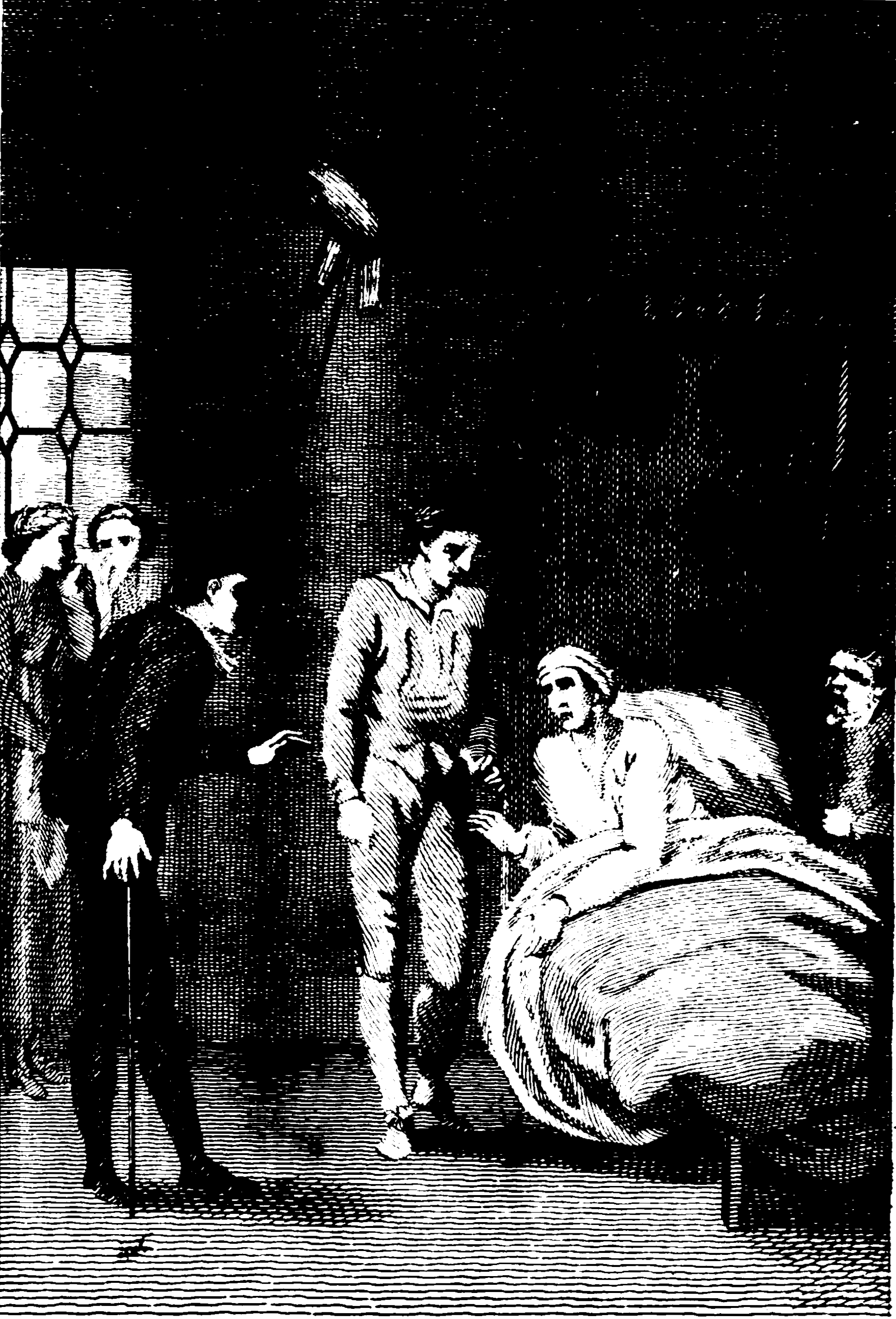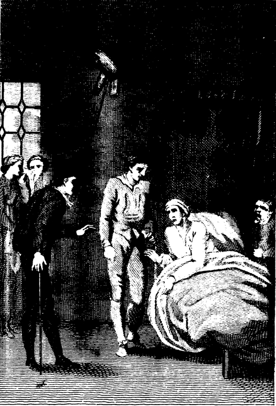 Lying in his bed, Don Quixote talks to the priest and the barber having regained his sanity. To his right, Sancho Panza waits patiently, and on the left the housekeeper and the niece worry for Quixote's health after a physician has diagnosed Quixote's health as poor. Don Quixote's armor and sword have been mounted on the wall in the background.