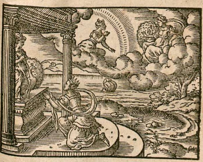 This engraving illustrates Alcyone, the wife of King Ceyx, kneeling at the temple of Juno praying for her husband’s return from sea. King Ceyx had traveled by sea to seek out the Oracle at Claros and ended up dying in a shipwreck due to a storm. Alcyone continuously prayed at the temple to Juno in the hopes that her husband would soon return. Juno is depicted at the altar with her sacred animal, the peacock, at her side. Juno decides to reveal to Alcyone that her husband is dead by sending Iris, the messenger of the gods, to the god of sleep to reveal Ceyx’s fate through a dream. Juno is depicted on a cloud in the background of the engraving giving these commands to Iris. There is a ship in the background to symbolize Ceyx at sea.