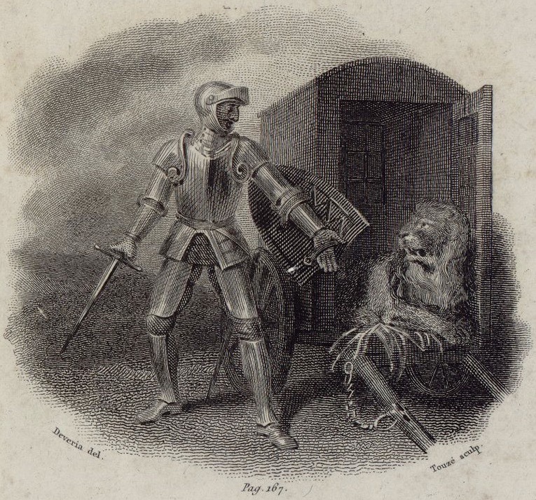 Don Quixote prepares to fight the lion after the lion keeper opens the gate. However, the lion refuses to leave its cage. Don Quixote holds his sword in one hand and his buckler in the other. Signed by A J.-J.-M. Devéria (illustrator) and P. C. Touzé (engraver). Part 2, ch. 17.