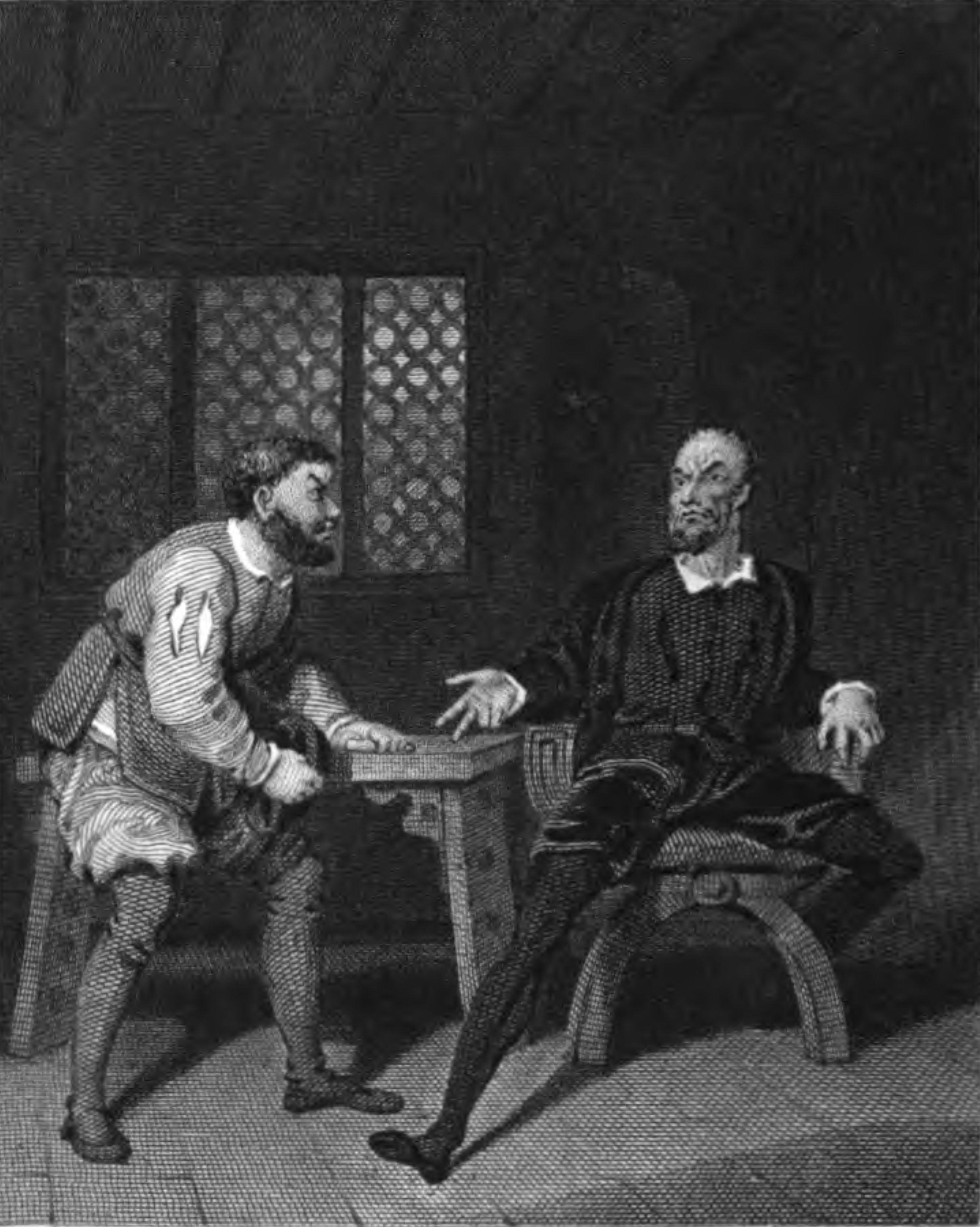 In the house of Sancho Panza (left), Don Quixote (right) sits casually in a wooden chair, right leg stuck out, left leg tucked behind the leg of the chair, with his right hand he postulates as if to promise Sancho many great things. Sancho Panza listens attentively, his left arm resting on a wooden table. In the background there is a window.