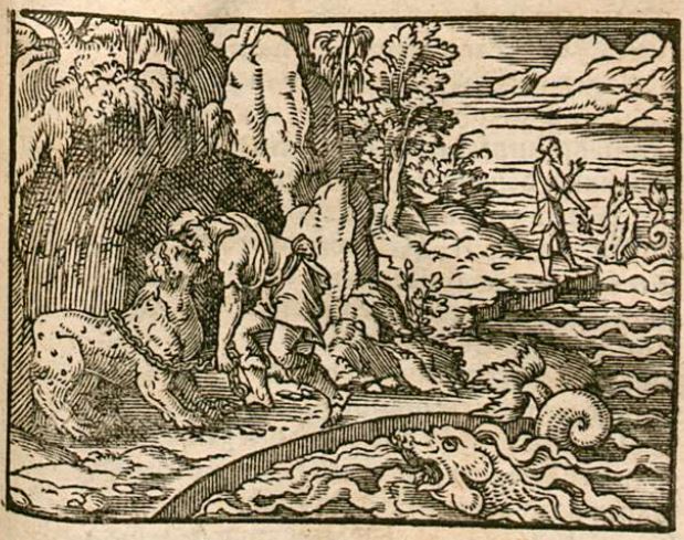 This engraving illustrates Peleus, Jupiter’s grandson, physically forcing himself upon the sea-goddess named Thetis. Thetis is a shapeshifter and changed forms every time Peleus attempted his advances on her. Peleus eventually sought the help of the sea-god Proteus as she continuously rejected him. Proteus is illustrated in the water in the background of the engraving, with Peleus standing on land speaking to him. Proteus suggested to wait until Thetis falls asleep, and then tie her up and hold her tightly until her shape-shifting returns her to her normal form. This is illustrated in the foreground of the engraving, as Thetis is depicted with her head in human form and her body in the shape of an animal with a chain wrapped around her body. Peleus is illustrated with his arm around her. Thetis eventually gives birth to the mighty Achilles.