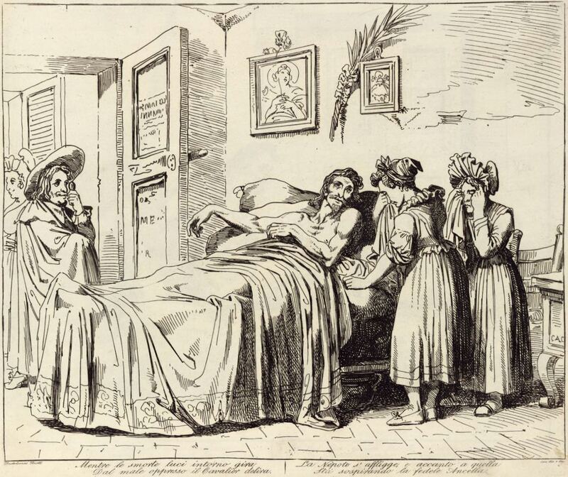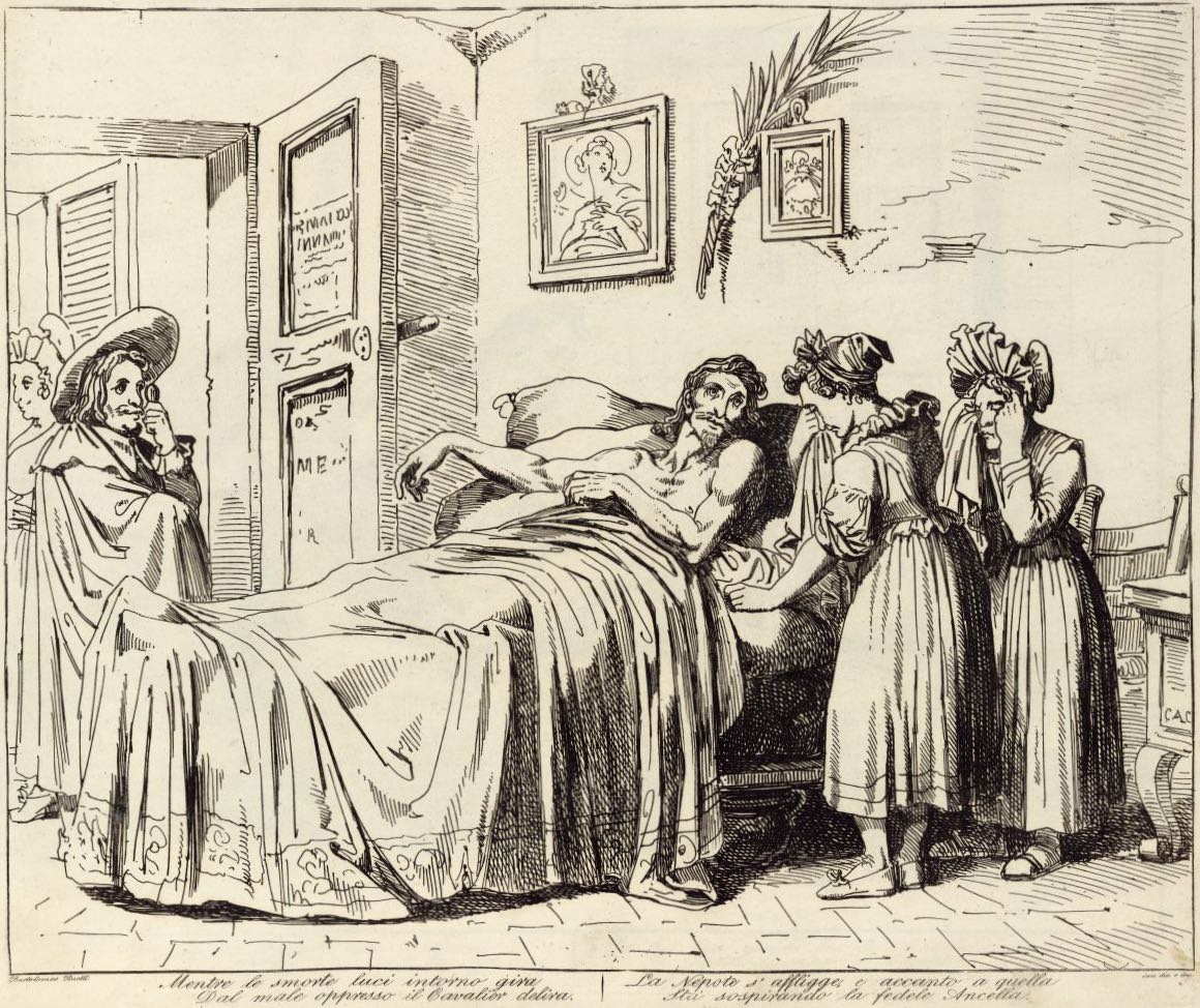 Mentre le smorte luci intorno gira / Dal male oppresso il Cavalier delira. / La Nepote s'affligge, e accanto a quella / Stà sospirando la fedele Ancella.