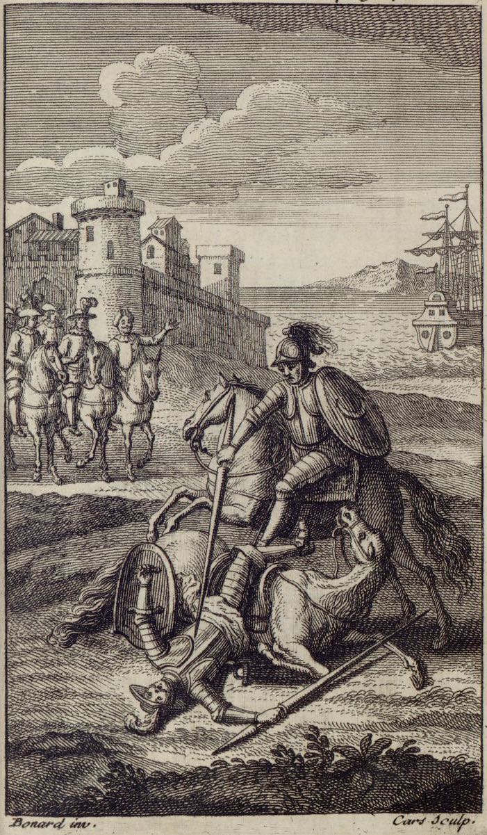The Knight of the White Moon (Sansón Carrasco) defeats Don Quixote on the beach at Barcelona. Both wear bucklers and carry lances. Sancho Panza, Don Antonio Moreno, and the viceroy watch. In the background, the port of Barcelona and a galley are depicted. Signed by Bonard (illustrator), no given name, and L. Cars (engraver). Part 2, ch. 64.