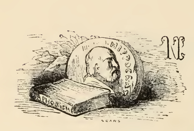 Laying on the ground in the background is a a bust of an older bald man with the name 'HIPPOCRATES' written on the exterior while in the foreground lies a book with the title 'APHORISMS' on its spine. The image is occasioned by , Doctor Pedro Kecio Aguero de Tirteafuera promising that Sancho Panza shall eat all he likes, though it is contrary to all the aphorisms of Hippocrates.
