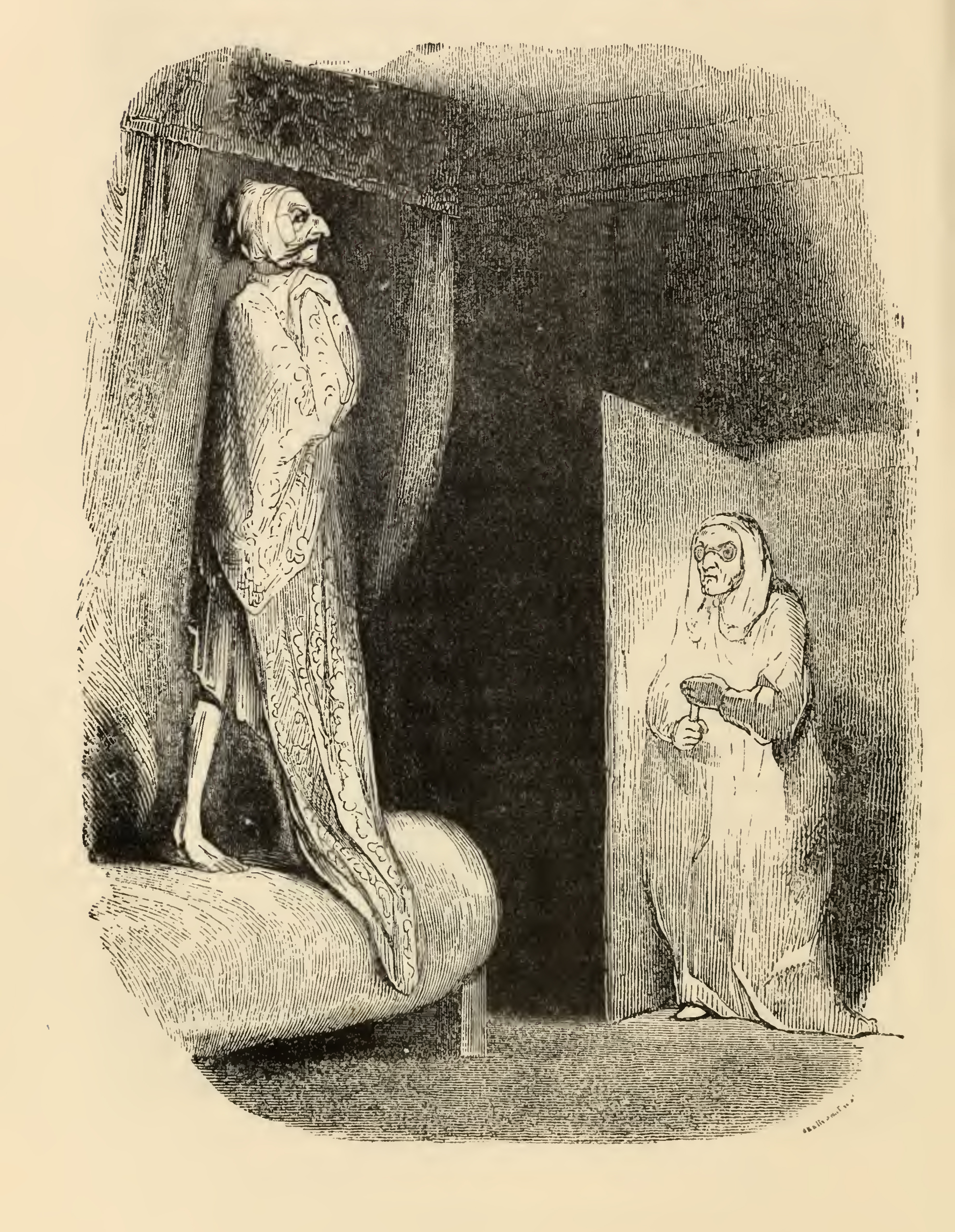 Don Quixote (lefts) stands upon a bed, wrapped from head to toe in a quilt of satin, a woollen cap on his head, and his face and mustachios bound up with bandages because of the scratches suffered at the paws of a cat. On the right, an elderly woman enters the room in a long white veil that covers her from head to foot. She carries between the fingers of her left hand a lighted candle, and holds her right hand over it to shade her face and keep the glare from her eyes, which are behind a huge pair of spectacles.