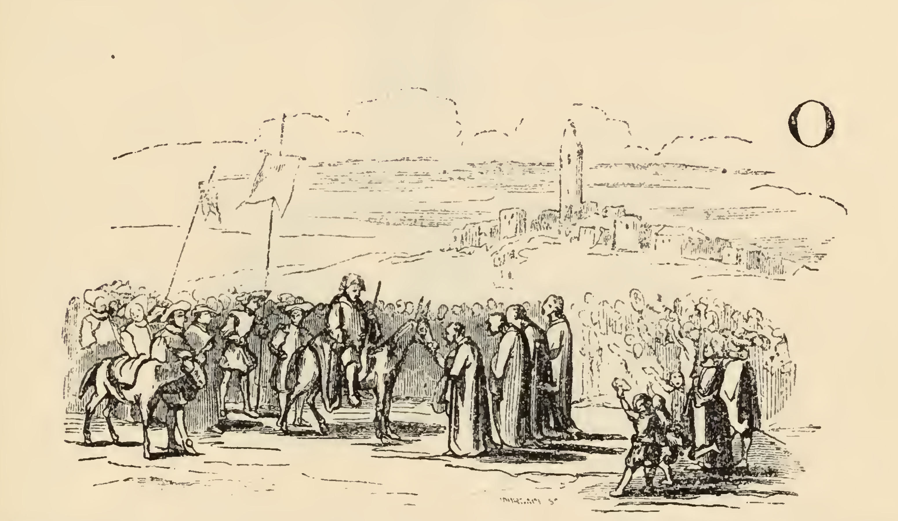 Sancho Panza (middle) sits upon a mule before four men dressed in white robes who praise Sancho for his upcoming governance. On the left, all of Sancho's attendants follow with banners and horses, Dapple, Sancho Panza's donkey, among them in the foreground on the left. On the right, about a thousand inhabitants raise their hats and cheer for their new governor.