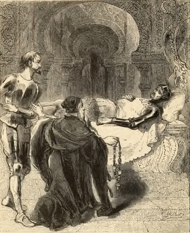 In the cave of Montesinos, within an alabaster hall, Don Quixote, clad in armor, stands before a marble tomb and bows slightly, introducing himself to Durandarte, a living cavalier who lies upon the tomb. Durandarte's right hand is laid on the region of his heart. Montesinos, a venerable old man with a long beard kneels before Durandarte and introduces Don Quixote with a motion of his left hand, he also carries a rosary of beads in his right hand.
