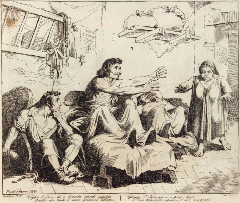 Having arranged to meet the muledriver late in the night, Maritornes enters the room where Don Quixote, Sancho Panza, and the muledriver are sleeping. She is barefoot, wears a chemise, and her hair is tied back in a cotton snood (all accurate to text). Don Quixote lies on a narrow bed made of rough boards, while Sancho Panza sleeps on a rush mat. Mistaking Maritornes for his fair damsel, Don Quixote extends his arms to welcome her. Signed by Bartolomeo Pinelli (engraver and illustrator) and dated Rome, 1833. Plate 21. Part 1, ch. 16.