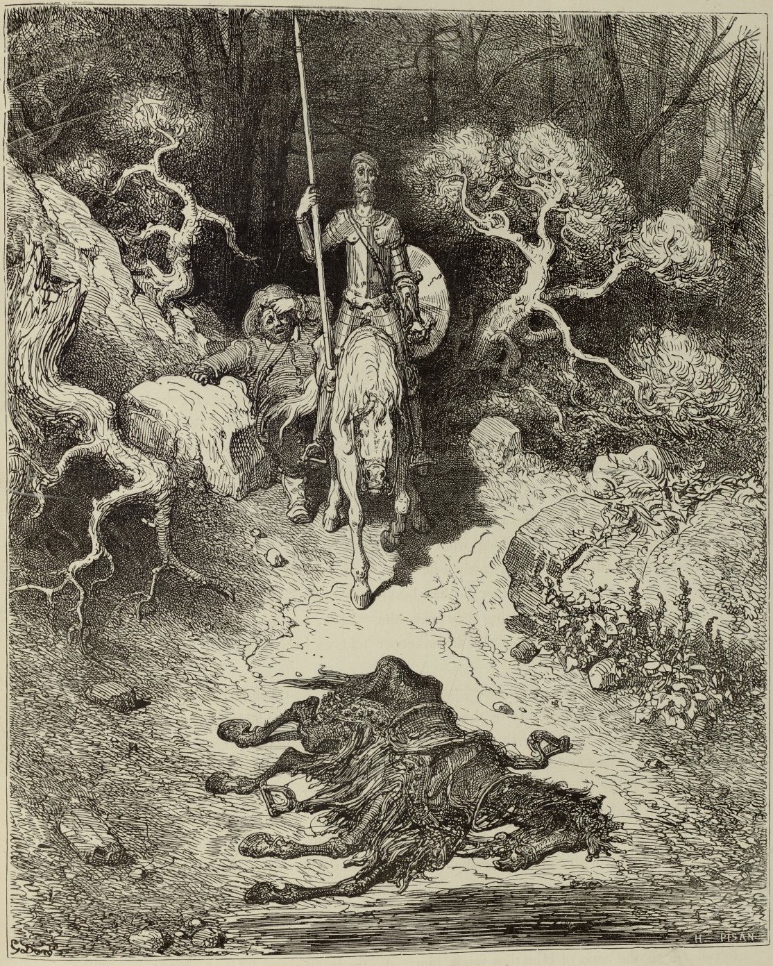 Don Quixote and Sancho Panza travel deeper into Sierra Morena to find the fleeing man (Cardenio). They discover a dead mule in a stream, half-eaten by dogs and pecked at by crows. The mule is saddled and bridled, which is confirmation of their suspicion that the fleeing man is the owner of both the mule and the saddle cushion. Signed by G. Doré (illustrator) and H.-J. Pisan (engraver). Part 1, ch. 23.