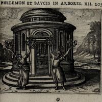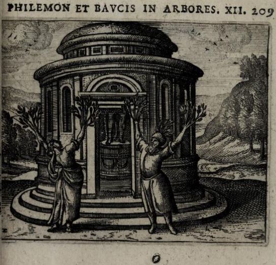 The Gods Jupiter and Mercury informed the couple Philemon and Baucis of their Godliness, and asked that they ascend the mountain to avoid a punishment destined for the rest of the city in return for their hospitality. As they reached the top of the mountain, they beheld their city sinking into mud, with their house alone still standing, having been transformed into a temple by the Gods. Jupiter and Mercury ask them what they desire most, and they ask to be priests to the Gods and to die at the same moment, so as never to be without each other. After serving years as priests, the two aged lovers were both transformed into trees near the front steps of the temple (as seen in this illustration).