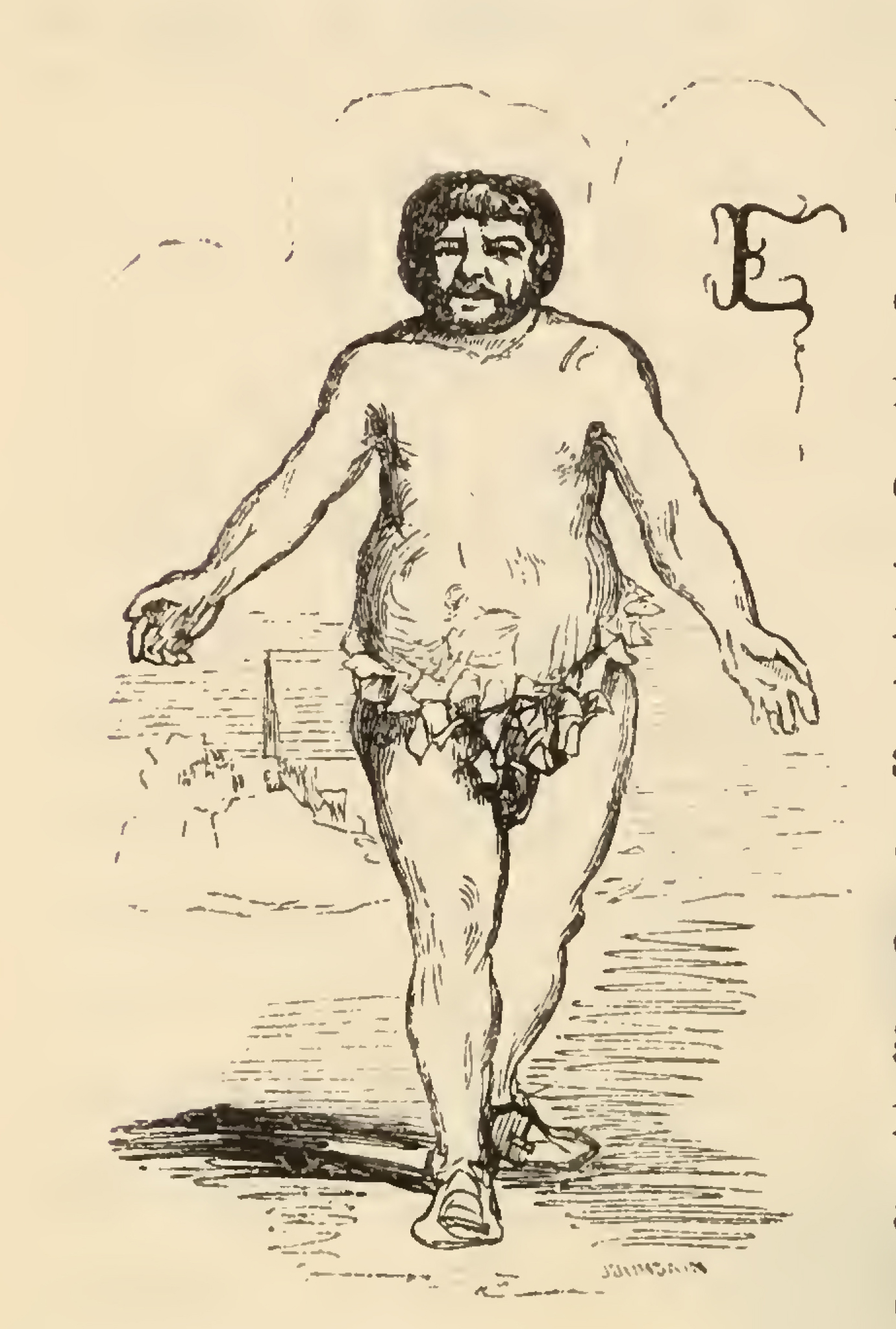 With his arms spread wide a bearded man wearing nothing but ivy over his groin walks forward. In the background a group of people and a house can be scarcely seen. The image is occasioned by Sancho Panza saying "In fine, naked I went into the government, and naked I am come out of it, and I can say, with a safe conscience, which is no small matter, ' Naked I was born, naked I am, I neither win nor lose" (Page 599).