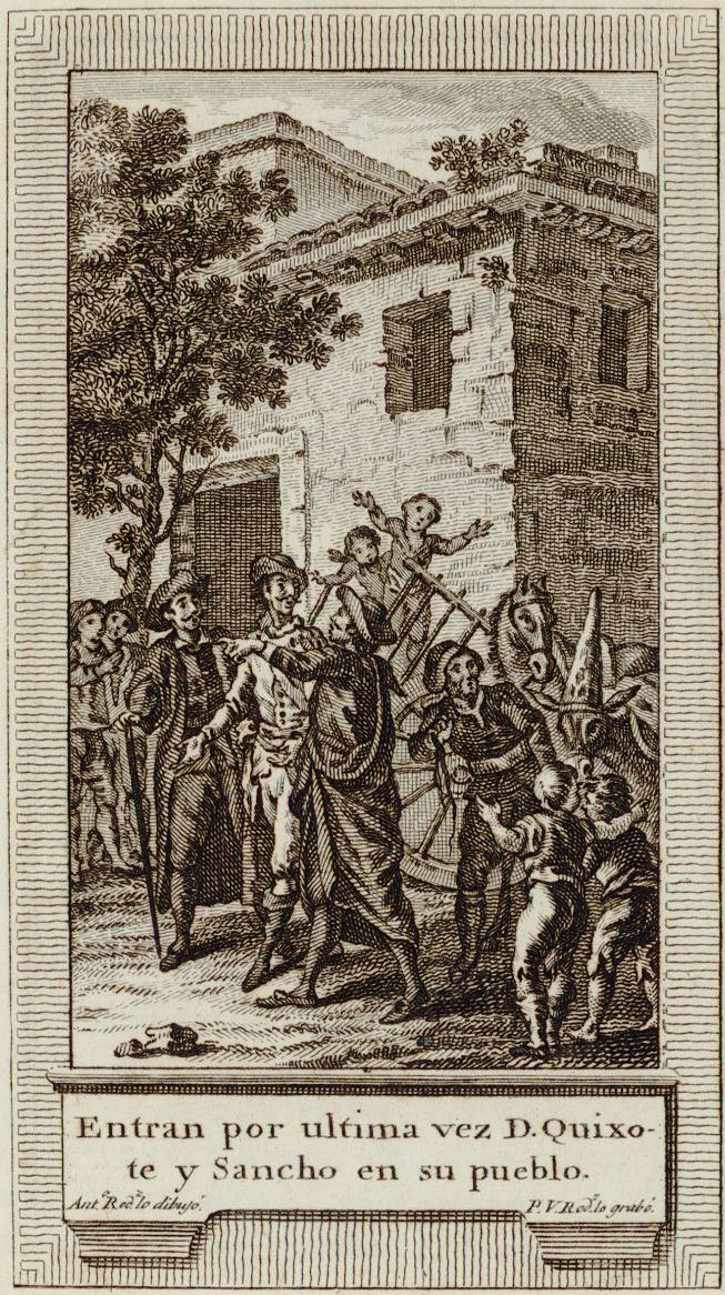 Don Quixote and Sancho Panza return to their village, and are welcomed by the priest, the barber, the housekeeper, Don Quixote’s niece, and Sancho’s family. Signed by A. Rodríguez (illustrator) and P. Rodríguez (engraver). Part 2, ch. 73.