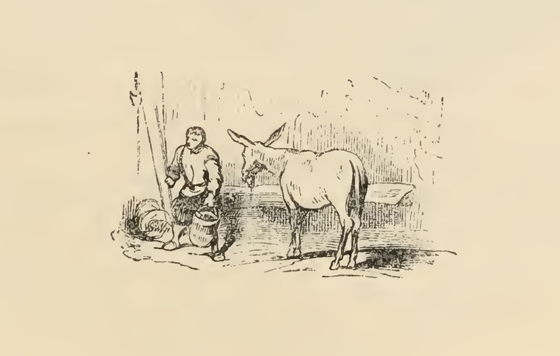 - A man sits on a bench in a stable of an inn, a bucket of water in his left hand. On the left two halberds lean against the stable's wall. On the right a mule eyes the bucket in the man's hand.