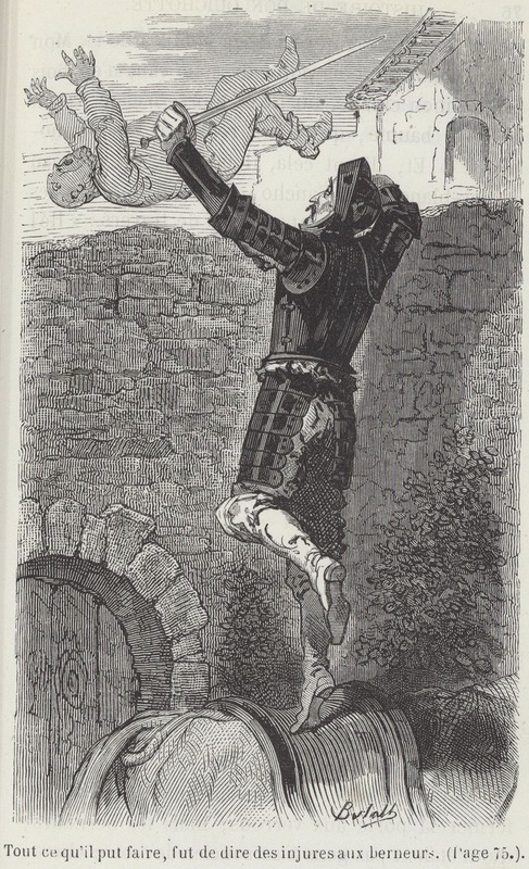 In the foreground, Don Quixote stands on Rocinante so that he can see over the wall of the inn. In the background, Sancho Panza is tossed into the air when he refuses to pay the innkeeper. Consequently, guests at the inn toss him in a blanket in the courtyard and make merry with him. Among the guests are four wool carders from Segovia, three needlemakers from El Potro in Córdoba, and two residents of La Feria in Sevilla. Signed by A. ‘Bertall’ d’Arnoux (illustrator). Part 1, ch. 17.