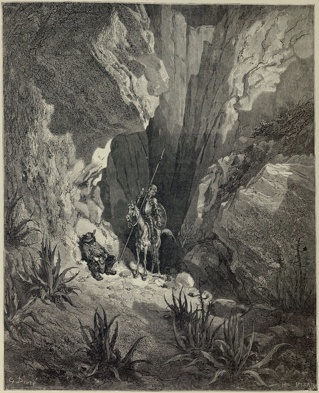 In Sierra Morena, Don Quixote and Sancho Panza find a travelling case, inside which are four shirts of fine cambric, a pile of gold escudos wrapped in a handkerchief, and a small, richly decorated diary. Opening the book, Don Quixote finds a sonnet written in a very fine hand. He reads it aloud so that Sancho can hear it. Signed by G. Doré (illustrator) and H.-J. Pisan (engraver). Part 1, ch. 23.
