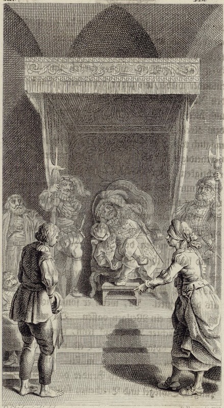 Sancho Panza, as governor and judge of Barataria Island, rules that twenty ducados be given back to the herder accused by a woman of having raped her. Sancho is flanked by the steward and the secretary, and sits on a throne beneath a canopy and a vaulted ceiling. Signed by D.-N. Chodowiecki (illustrator) and D. Berger (engraver), dated 1779. Plate 14. Part 2, ch. 45.