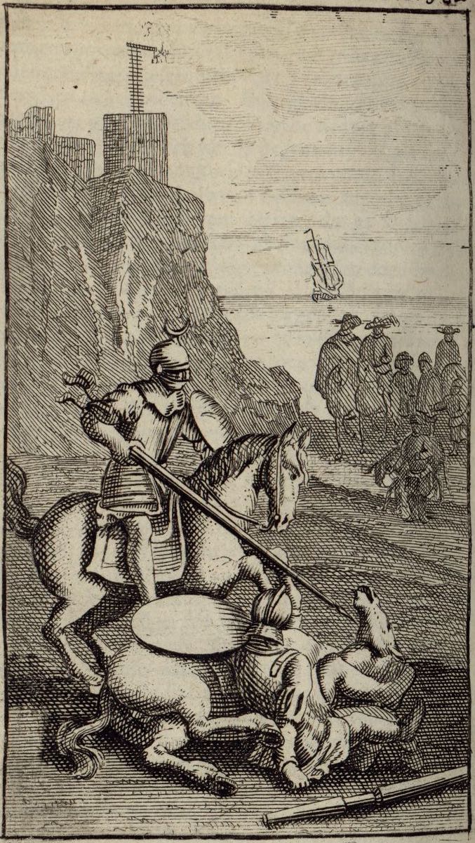 In the foreground, the fallen Don Quixote and Rocinante are defeated by the Knight of the White Moon (Sansón Carrasco) on the beach in Barcelona. Sancho Panza, Don Antonio Moreno, and the viceroy look on. In the background, the galley and tower of Barcelona are pictured. Unsigned. Part 2, ch. 64.